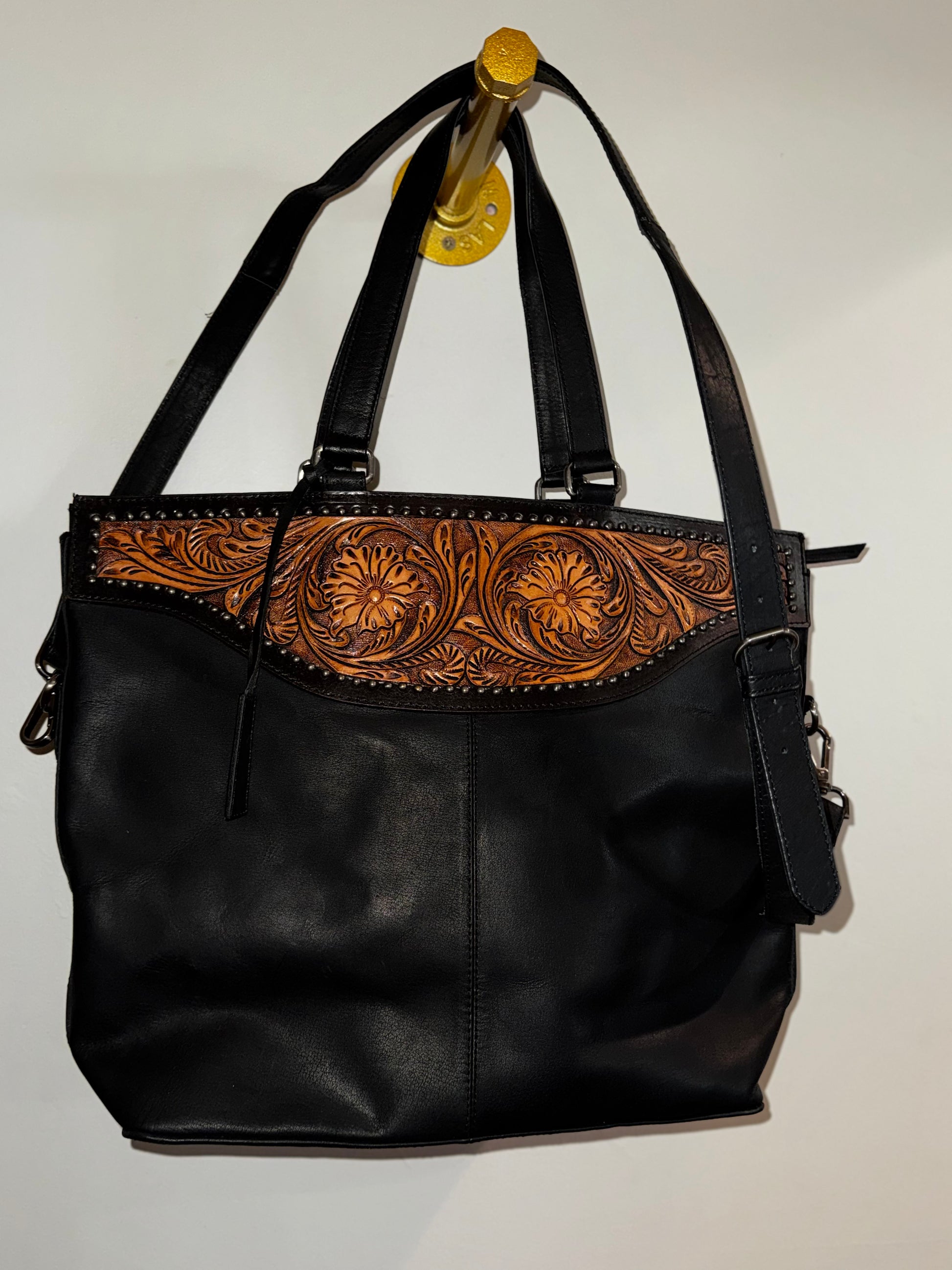 Nocona Stacey Black Leather Western Style Tote with a Floral Hand Tooled Yoke and Conceal Carry Feature